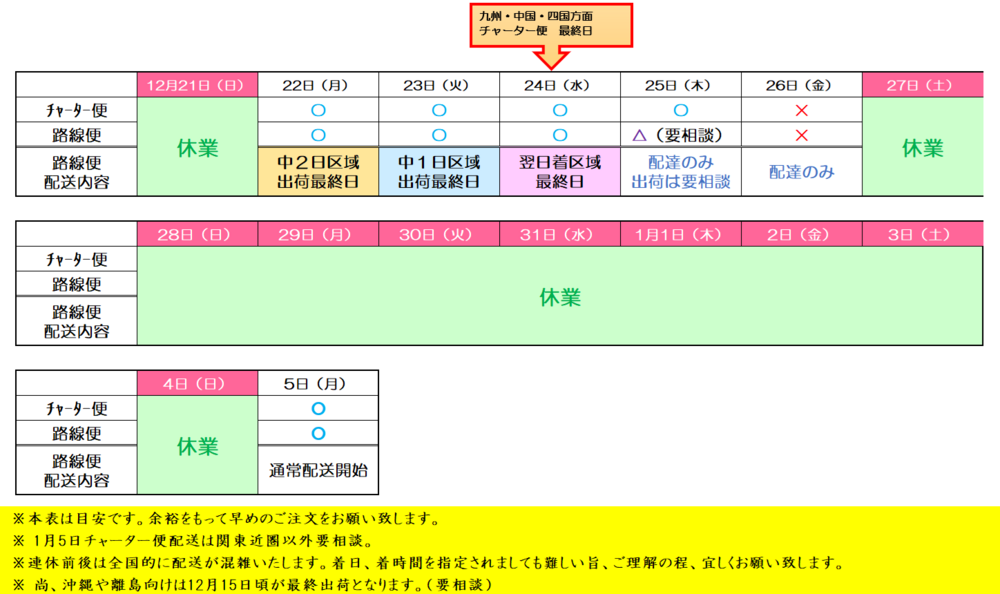 さて、年末年始における出荷体制を下記の通りとさせていただきます。